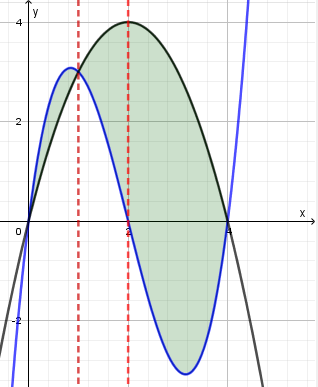 \(A_2 = \small \int\limits_1^2 g(x)dx -  \int\limits_1^2 f(x)dx =  \biggl [ -\frac{1}{3}x^3+2x^2 \biggr ]_1^2- \biggl [ \frac{1}{4}x^4-2x^3+4x^2 \biggr ]_1^2=\frac{11}{3}-\frac{7}{4} = \frac{23}{12} \)