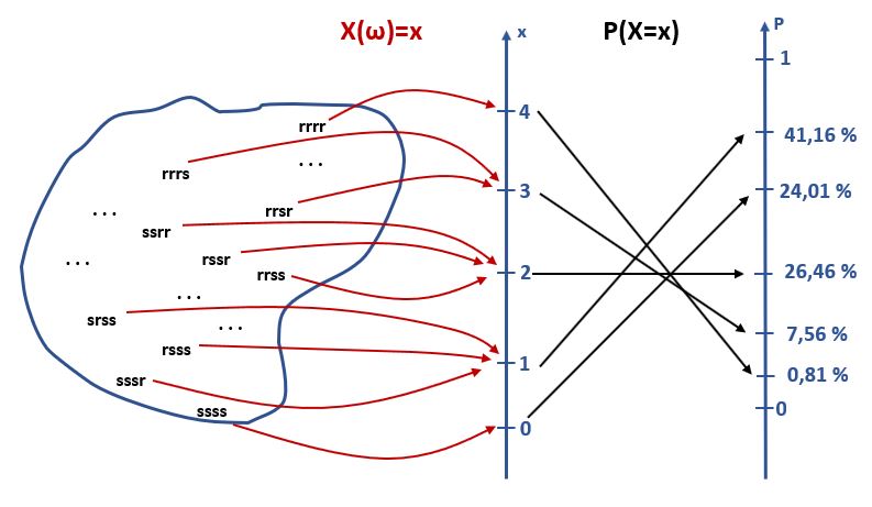 Mit Hilfe der Lapace-Wahrscheinlichkeiten und Mitteln der Kombinatorik kann für jeden Wert der Zufallsgröße X die zugehörige Wahrscheinlichkeit