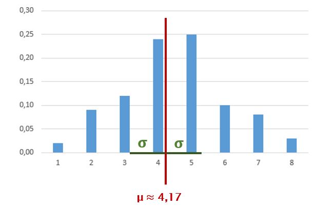 Während die Standardabweichung dieselbe Einheit wie der Erwartungswert \(\mu\) hat (z.B. Euro) und daher im Histogramm bzw. Stabdiagramm veranschaulicht werden kann, ist dies bei der Varianz wegen des Quadrates nicht möglich!
